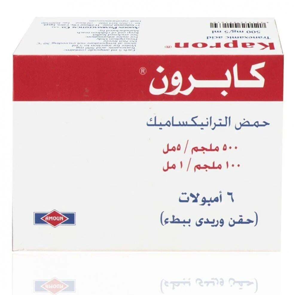 كابرون حمض الترانيكساميك 6 امبولات 500 مجم كابرون Kapron من أشهر الأدوية المضادة للنزيف، فهو يعمل على تقليل أو وقف فقدان الدم بشكل مفرط بعد العمليات الجراحية وبعد الولادة، وأيضا يحد من غزارة الطمث، كما أنه يعالج تجلطات الدم تحت الجلد الناتجة عن نزف الأوعية الدموية، ويعالج أيضا نزيف الأنف. ويؤخذ عن طريق الفم أو الحقن بالوريد.